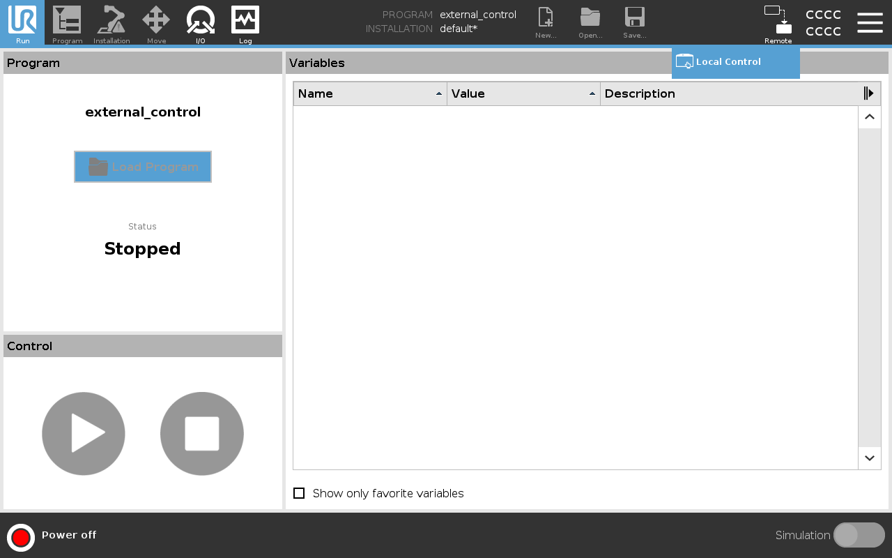Begin by navigating to the Programs/URCap section, make sure the program is empty except for the addition of the ExternalControl task. Save the program as external_control.urp: