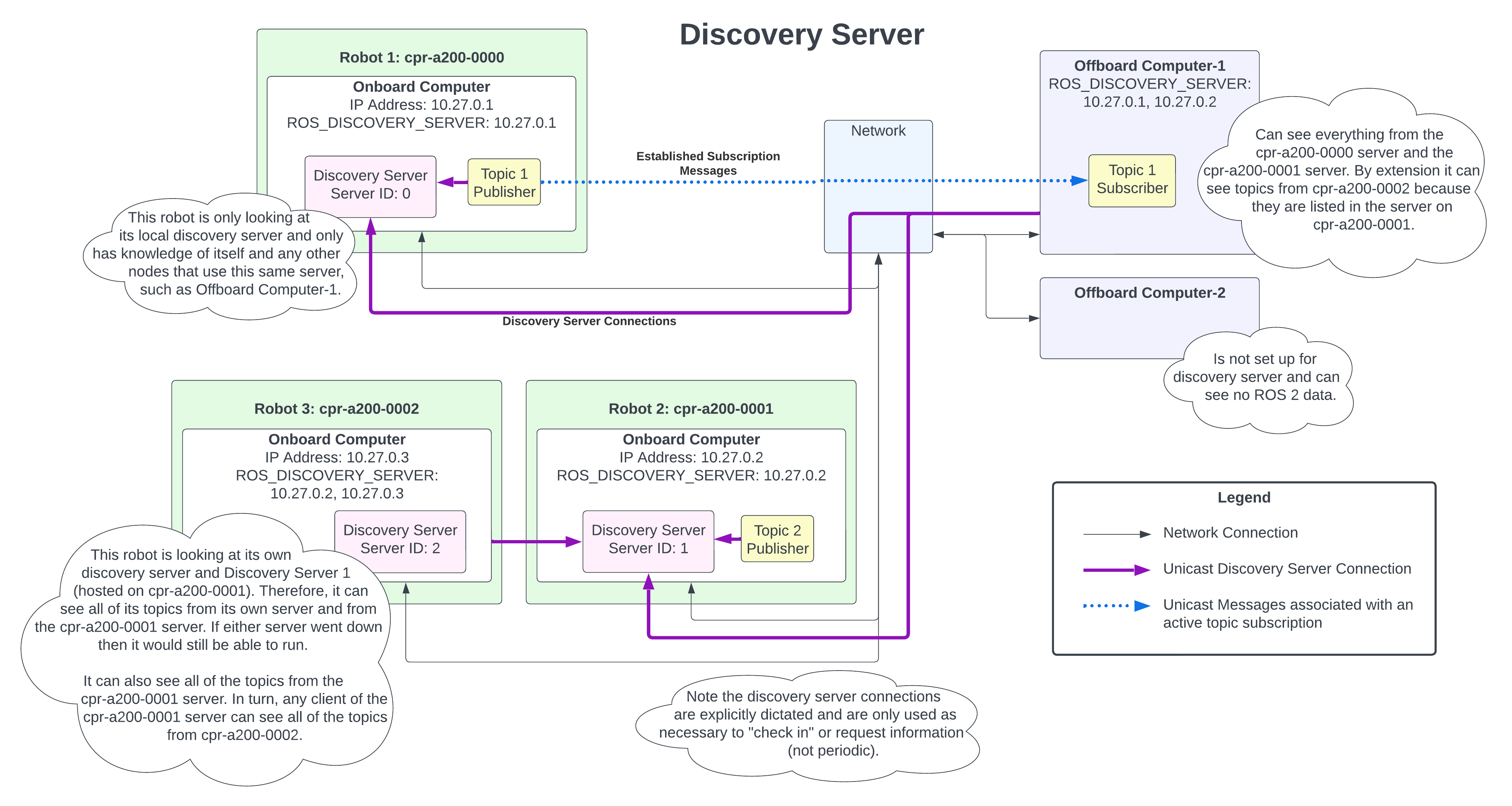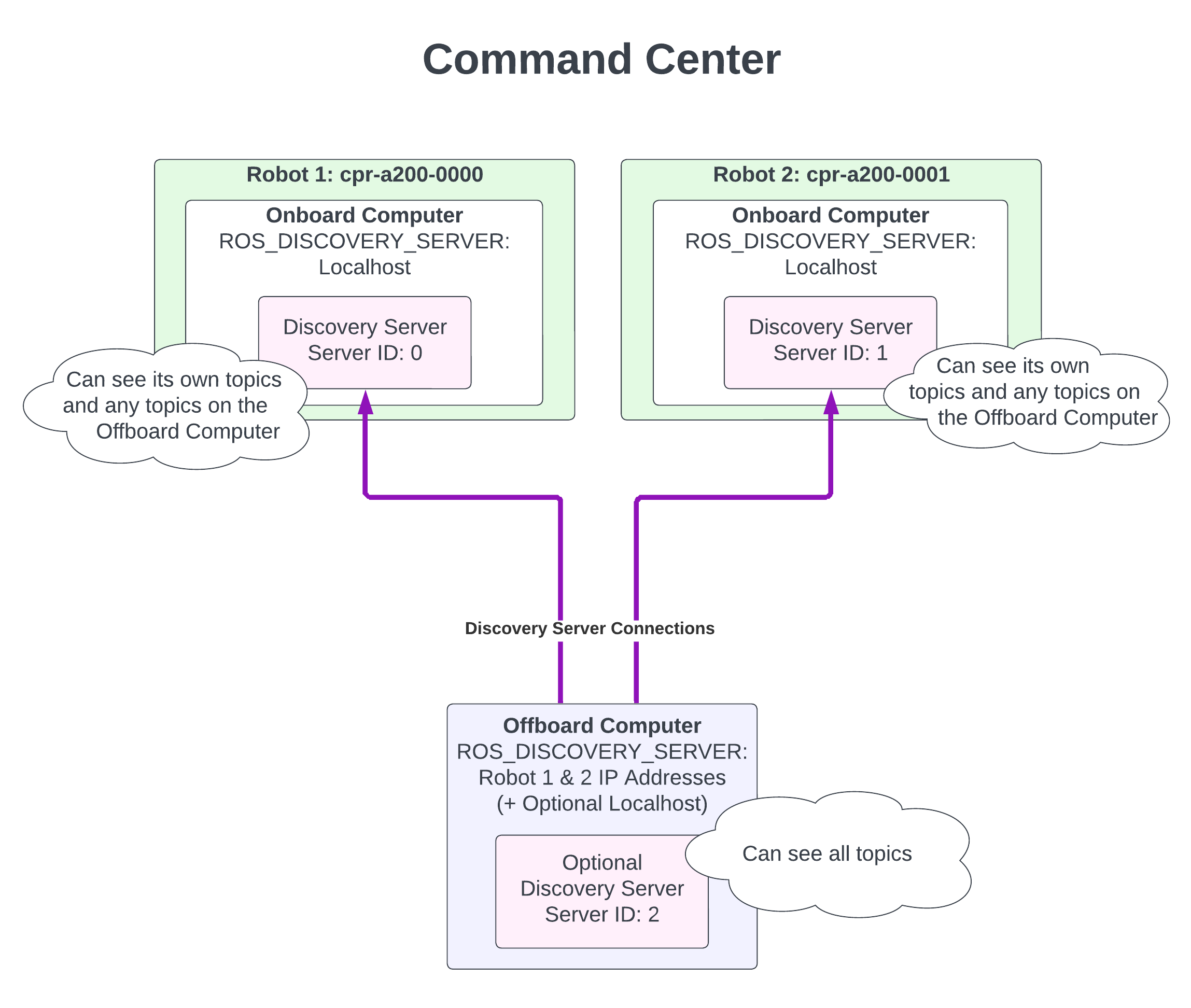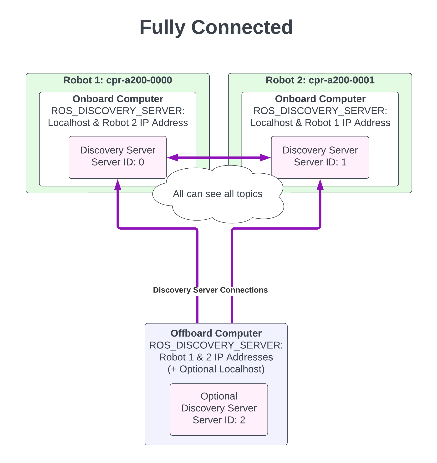 In this configuration you have many robots that each operate independently and an offboard computer that checks in and communicates with each of the robots. Each of the robots will have and refer to their own local discovery server. This allows the onboard ROS 2 nodes to communicate without any external network connection. The offboard computer will be pointed at the discovery servers on each and every robot. This will allow the offboard computer to see all of the topics on all of the robots at the same time. In turn, each of the robots will be able to see all of the topics launched on the offboard computer. Including a discovery server on the offboard computer as well allows it to run ROS 2 nodes independently from the robots.