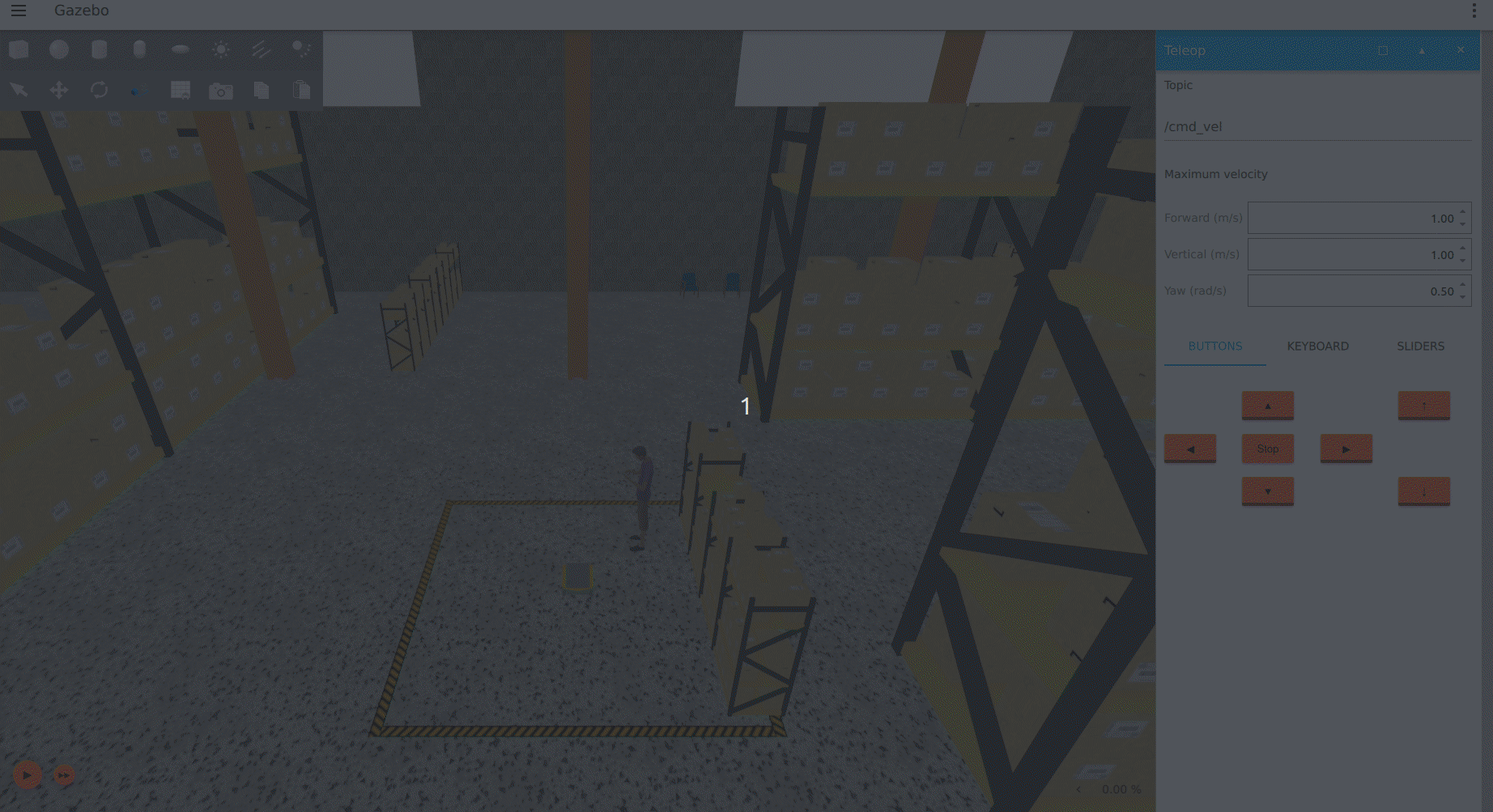 Gazebo is launched. If your robot has a namespace, change the topic to <namespace>/cmd_vel. Set the maximum forward