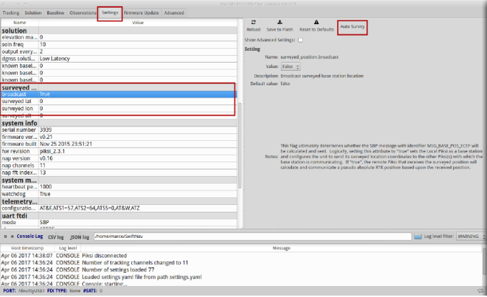 Use the Piksi console connect the base station GPS. Go to "Settings -> surveyed position", click to any field in this section and then click the button on the top right corner "Auto Survey". The figure below shows these steps. The last 1000 GPS points will be used to compute the position of the Base Station.