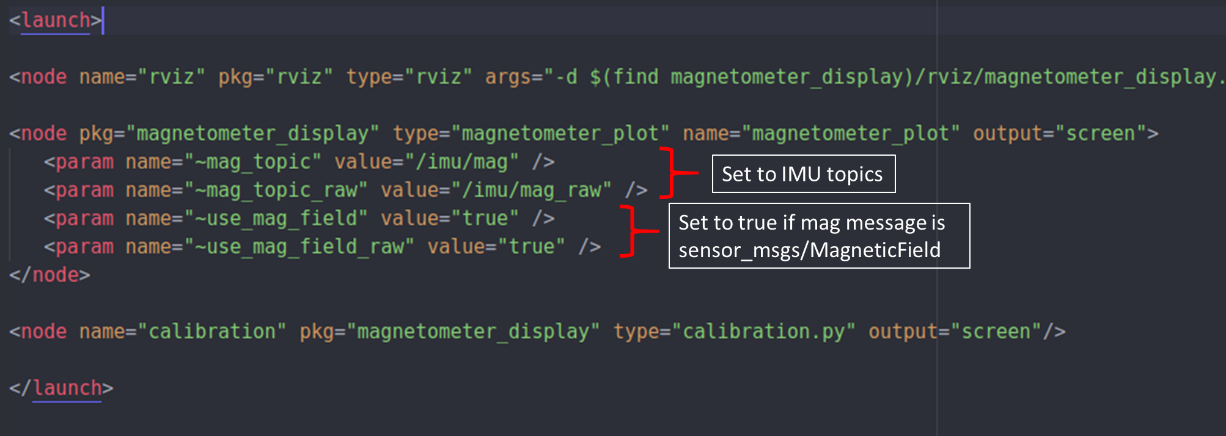 magnetometer.launchfile in themagnetometer_displaypackage and change the sections shown in the figure below. Specifically, setuse_mag_fieldto true when the IMU is outputting magnetometer measurements with asensor_msgs/MagneticFieldmessage, otherwise set to false. Microstrain is the only IMU which uses the MagneticField message type.