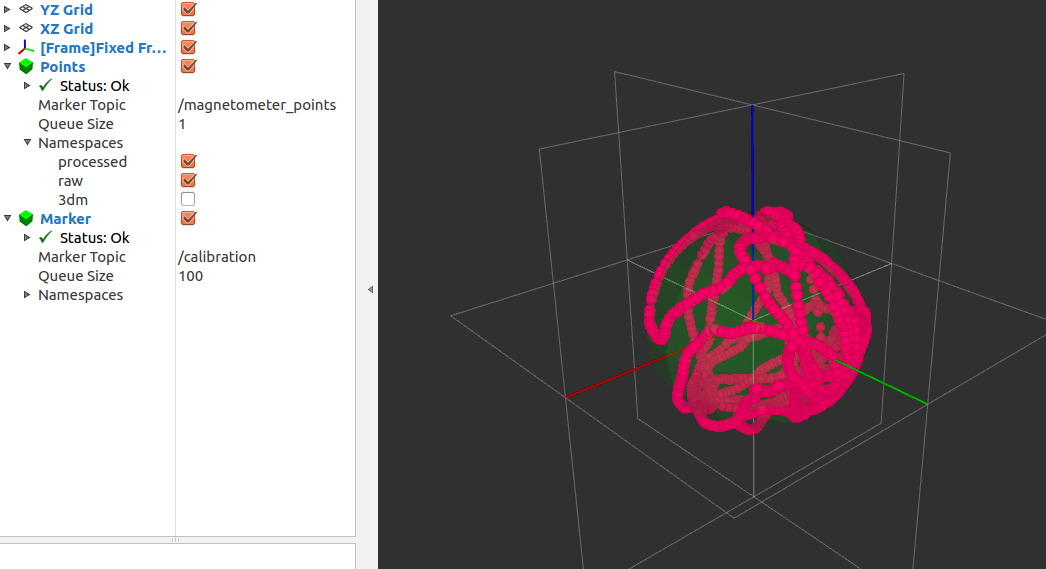 Move the IMU around to get good coverage. RViz will display magnetometer points (red) and will plot current ellipsoid fit (green) as shown in the figure below.