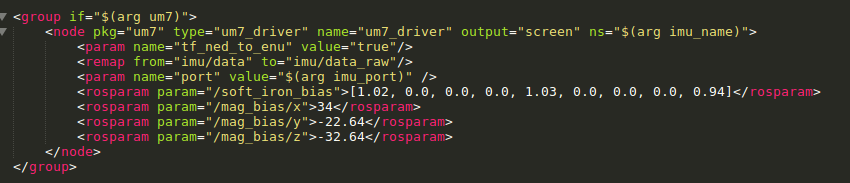 sensor.launchfile in thecpr_gps_localizationpackage and go to the UM7 (or UM6) section of the launch file. The figure below shows this section for the UM7.