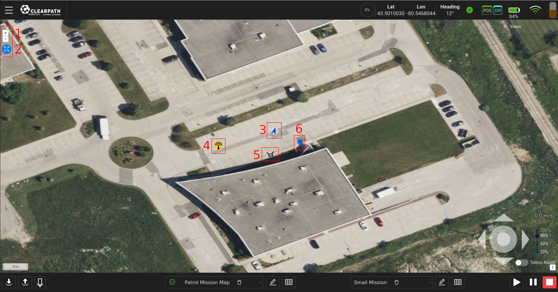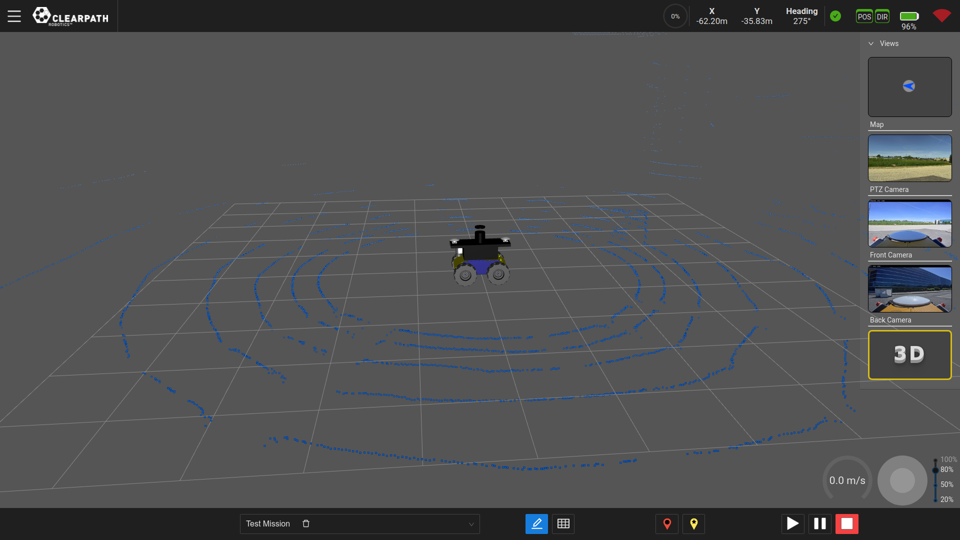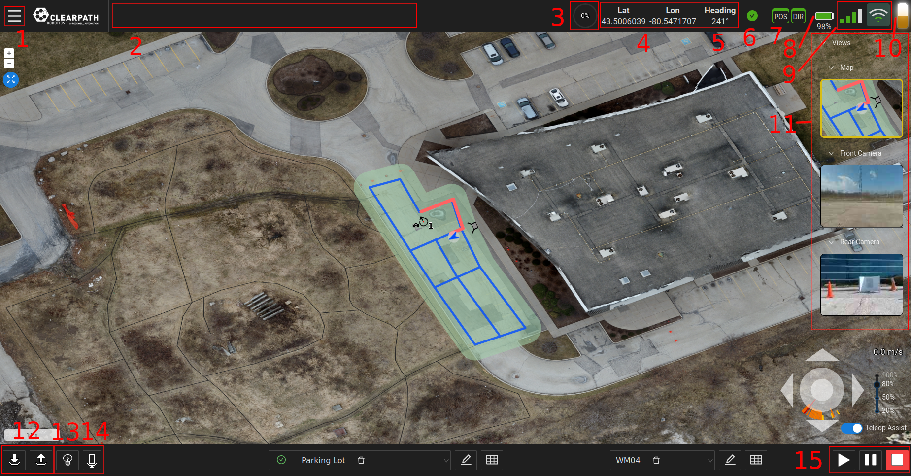 The Web User Interface (Web UI) provides a easy, graphical, means to control both manual and autonomous operation of your UGV. The following sections outline: the components and views of the UI, the details of operating in manual mode, and the details of operating in autonomous mode.