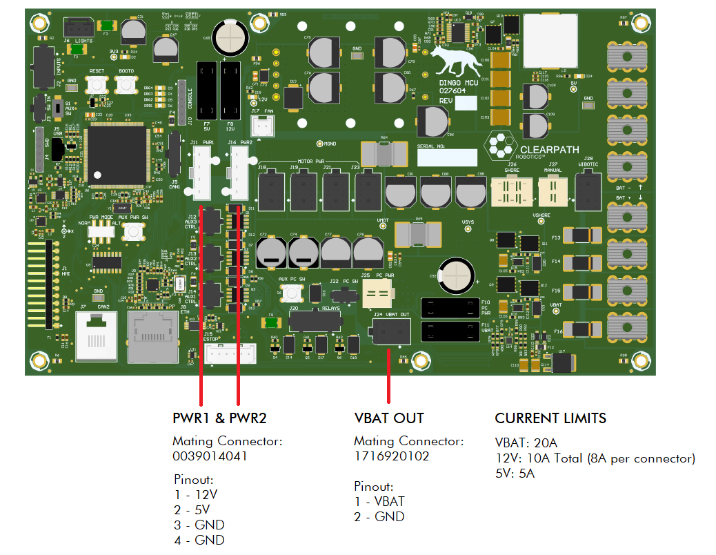 | PWR1, PWR2 | Dingo 1.0: Molex 0039301040 Dingo 1.5: Molex 0039302040 | Dingo 1.0: Molex 0039012040 Dingo 1.5: Molex 0039014041 | Molex 0507528200 (AWG 20-22) or Molex 0503518100 (AWG 22-28) | Molex 2002184900 |