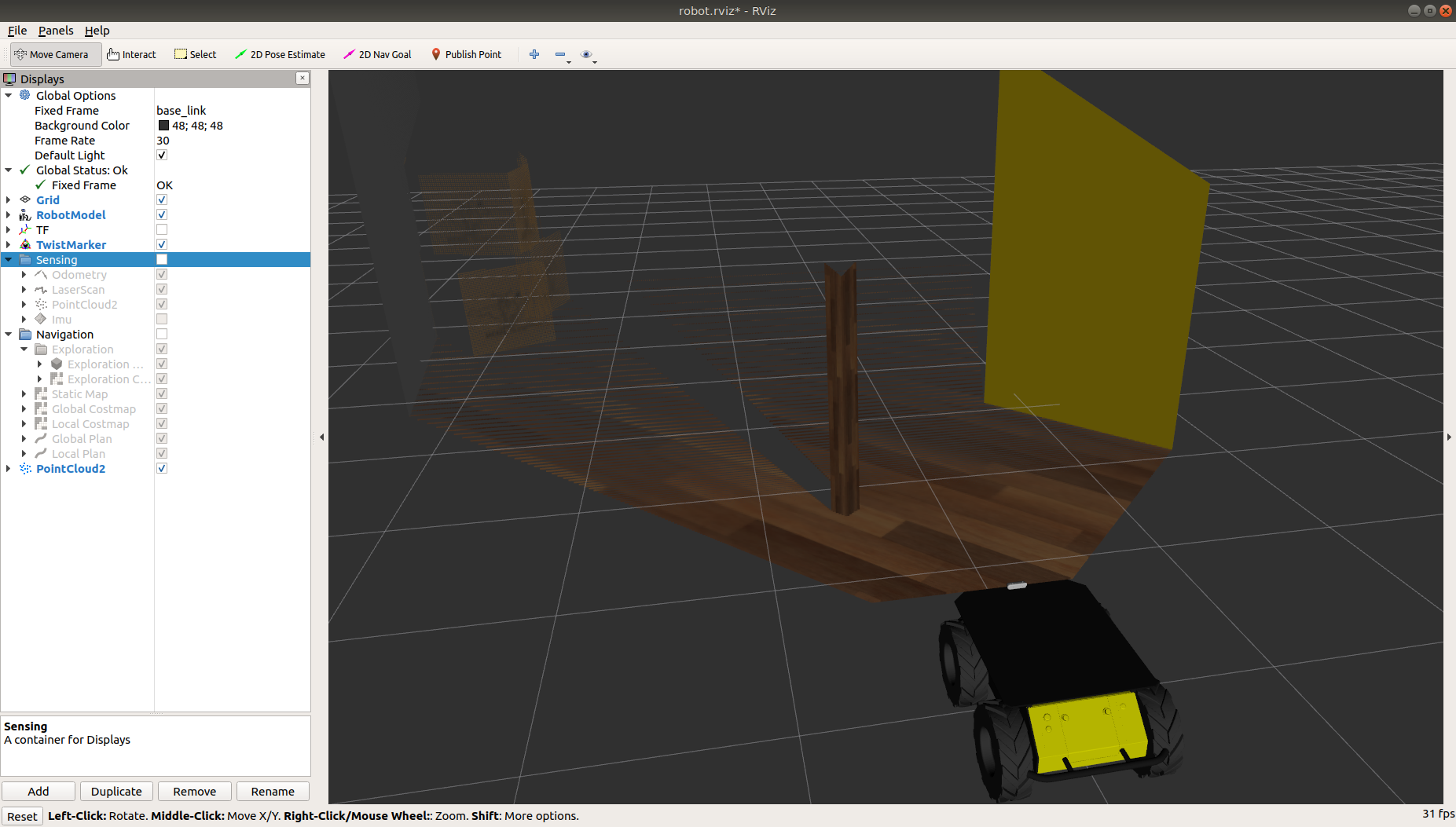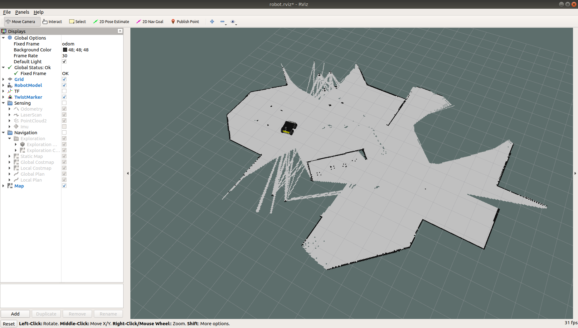 Once the simulation is running you can use RViz and other tools as described in the Gmapping and AMCL demos to control and monitor the robot.